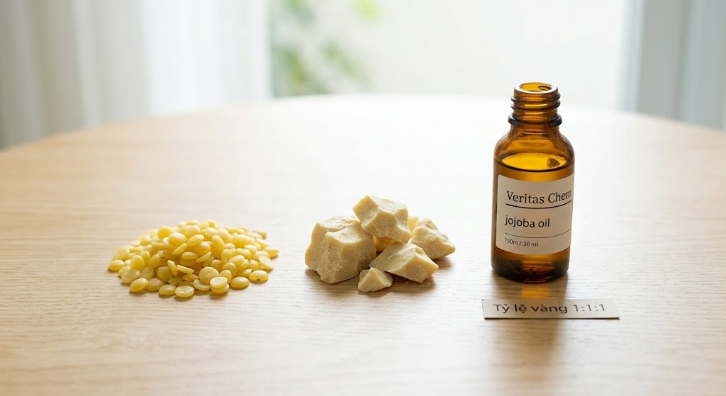Hướng dẫn chi tiết cách làm son dưỡng môi handmade từ dầu (Jojoba, Hạnh nhân) và bơ (Cacao, Shea). Công thức trị thâm, dưỡng ẩm sâu chuẩn chuyên gia cùng Veritas Chem.