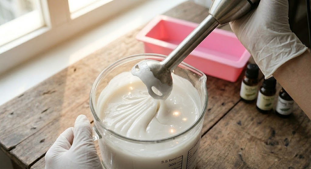 Bước 4: Tiến hành "Trace" (Phản ứng xà phòng hóa) Khi dầu và dung dịch xút có cùng mức nhiệt độ (hoặc chênh lệch không quá 5°C), nhẹ nhàng đổ dung dịch xút vào âu dầu dừa. Dùng máy đánh trứng cầm tay sục từng nhịp ngắn, kết hợp khuấy tay. Khi hỗn hợp chuyển sang màu đục và sệt lại như súp (đạt trạng thái Trace), hãy cho tinh dầu vào và khuấy đều.
