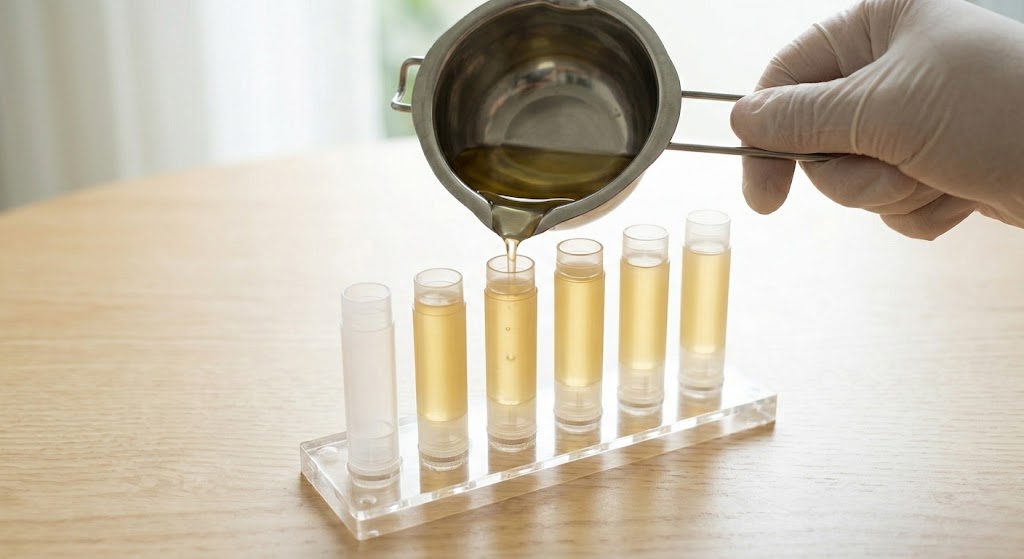 Bước 2: Đun chảy hỗn hợp (Melting) Cho Sáp ong, Bơ Cacao và Dầu Jojoba vào cốc thủy tinh. Đặt cốc vào một nồi nước nhỏ (đun cách thủy) trên lửa liu riu. Vừa đun vừa khuấy nhẹ tay cho đến khi hỗn hợp tan chảy hoàn toàn thành một chất lỏng trong suốt.